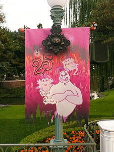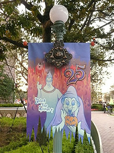 プラザ周辺のフラッグ。白雪魔女&ハデスお化け。魔女の持ってるのがリンゴでなくカボチャになってる辺りがニクイです。